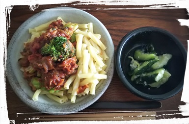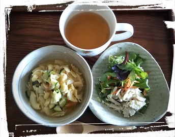 昼)ラタティユマカロニ/きゅうりの中華漬物 ※昨晩のラタティユの残りに、茹でたブロッコリーを加えて、 マカロニに乗せました。 |