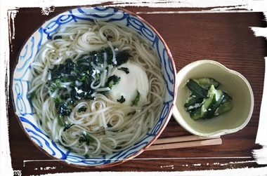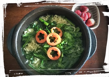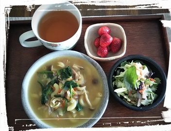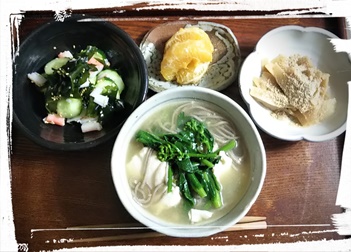 昼)小松菜卵入りそば 今日も暖かいものでお昼ご飯を。 小松菜をたっぷり入れて、天かすもいれました。 身体が温まります。 |