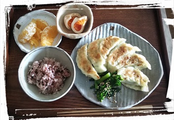 夜)餃子/キュウリとうそカニとわかめの酢の物 時々、無性に、餃子が食べてくなります。 キャベツ、にらをたっぷり入れて 黙々と食べます。 味付けのメインは、塩糀です。 |