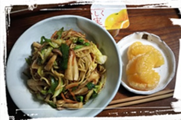 昼)焼きそば/甘夏 ※キノコ類、ピーマンのソース焼きそばは、たまに食べたくなる ソース味(^_-)-☆ |