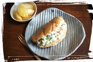 朝)ポテトサラダクロワッサンサンド/甘夏 昨晩のポテトサラダを使って、サンドに ほんのり甘いクロワッサン(生協)にピッタリです。 |