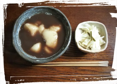 昼)うずら豆煮の汁のお汁粉(お正月の飾り餅)/千枚漬け | ||