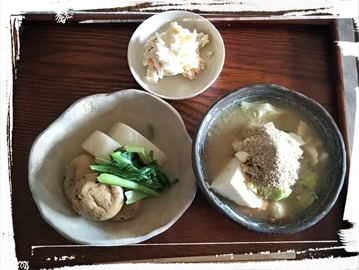 夜)大根とがんも煮/ポテトサラダ/納豆麴/味噌汁(ゴボウ、ニンジン、豆腐、ごまおから) 「ごまおから」をご存知でしょうか? ※山口ごま本舗 すりごまのようなものですが、 香ばしくて、本当に美味しいのです。 娘に「お味噌汁に入れる美味しいよ」と教えてもらったら、 ま〜〜〜、本当に美味しいこと! |
