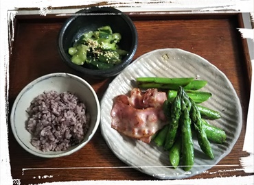昼)アスパラベーコンソティ/キュウリの梅塩麹漬け ※アスパラガスはさっと茹でると何もつけずに美味しくいただけますが、 ベーコンとも相性がいいので、ばくばくいただけます(^_-)-☆ ※キュウリの梅塩麹漬けは、娘のオススメの一品。 孫の大好物。 たたきキュウリに、梅干し、ごま油、塩麴だけ、よくあえて。 仕上げにかつお節を混ぜても美味しいです。 |