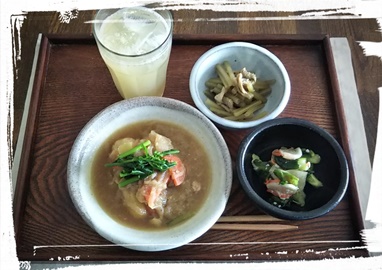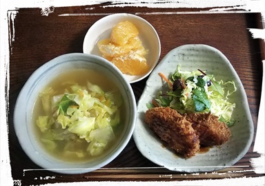 昼)肉じゃが/フキ煮物/漬物/自家製レモンスカッシュ | ||