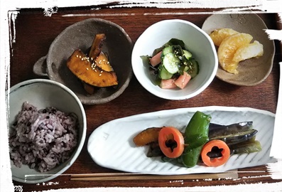 朝)茄子とかぼちゃとピーマンの煮びたし/かぼちゃの素揚げ酢漬け/ キュウリとわかめとうそガニ酢の物/甘夏 ※昨晩の残りで。 かぼちゃは、昨晩素揚げして白だしにしたものとは、別に、素揚げ後、 らっきょう酢と少しのお醤油に付けて、さっぱりと・・・ |