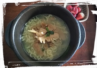 昼)野菜ラーメン(キャベツ、のらぼう菜、メンマ)/苺 ※寒かったので、温かいものを食べてくなりました。 冷蔵庫に残っていた メンマを見て、ラーメンにしました。 ※ラーメンよりもキャベツの千切りとのらぼう菜の方が、多い感じです(笑) ※人参は、昨晩の煮物の飾り用の人参の外側を・・・ ※残りが少なくなったとことで、メンマを入れ忘れていたことを思い出しました。 このメンマは、私が掘った 筍で作ったメンマです。 う〜〜〜ん、美味しいです(笑) |