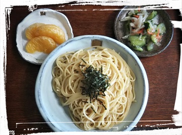 昼)たらこパスタ/漬物/甘夏 ※市販の「たらこソース」なるものを使ってみましたが、 美味しいのに驚きました (^_-)-☆ 刻みのりまで付いていて、美味しいです。 今度は、何か追加してアレンジを楽しみたいと思います。 |