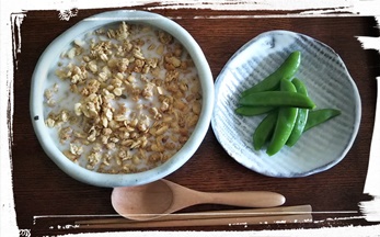 昼)グラノーラ/茹でスナップエンドウ ※朝食がパンチがあったので、お昼は軽く・・・ もぎたえのスナップエンドウは、何もつかなくても美味しい!! |