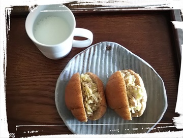 朝)ツナポテチサンド/牛乳 ※ツナ缶(油を切ったもの)と細かく砕いた青のりポテトチップを マヨネーズで和えるだけ 適度な塩味、何とも言えない食感、 こってりさけど、後を引く美味しさです(^_-)-☆ |