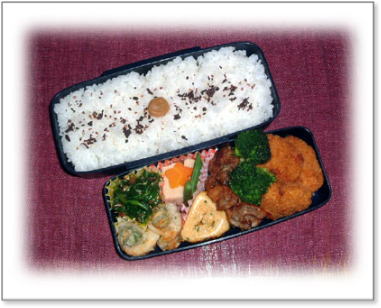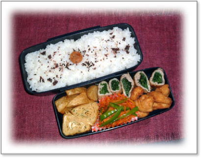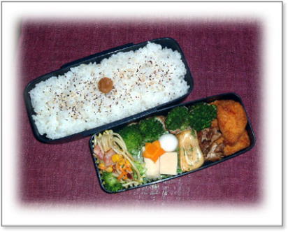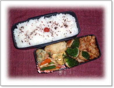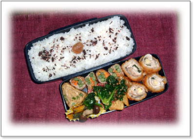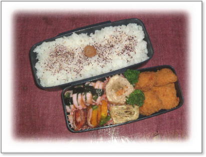 豚肉野菜巻き(ほうれん草) ささみのチーズフライ にんじんとさやいんげんの金平 厚焼き玉子(パセリ入り) ポテトフライ カリカリ梅ご飯 |