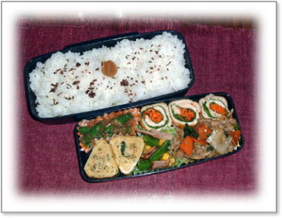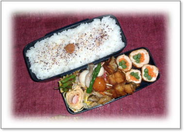 | ささみの野菜巻き焼き(大葉・にんじん) 根菜きんぴら(レンコン・にんじん・ほうれん草) 厚焼き玉子(パセリ入り) バターいため(スナップエンドウ・ベーコン・コーン) グリーンアスパラガスのおかか和え カリカリ梅ご飯 |