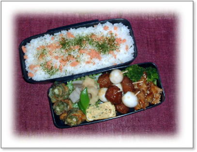 焼肉(豚肉)ブロッコリー添え 肉団子とうずら串 筑前煮 ちくわのチーズいり磯辺揚げ 厚焼き玉子(パセリ入り) さけゴマ青海苔ご飯 |