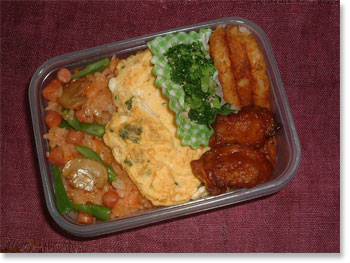 洋食ランチ弁当 ケチャップライス(たまねぎ・インゲン・ウインナー) オムレツ(パセリ入り) 鶏のから揚げ ハッシュドポテト ブロッコリーの胡麻和え |