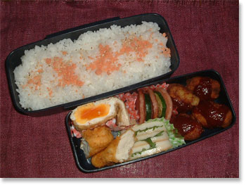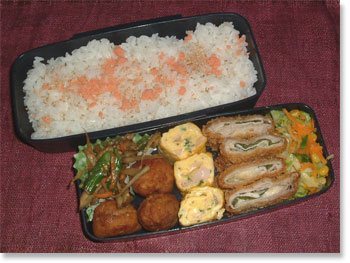 豚肉のチーズ大葉入りカツ キャベツとニンジンとコーンソティ 厚焼き玉子(パセリ・ハム入り) 野菜のきんぴら(ごぼう・ニンジン・アスパラ) ジャガイモ入り肉団子 鮭フレークごまご飯 |