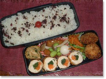 | 豚肉野菜巻きカツ(にんじん・大葉・チーズ) 千切りキャベツ ささみのから揚げ 焼き玉子(ニンジン捲き) 厚揚げとブロッコリー炒め いんげんのベーコン巻 カリカリ梅ご飯 |