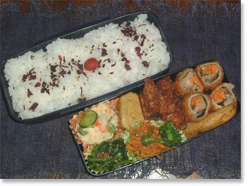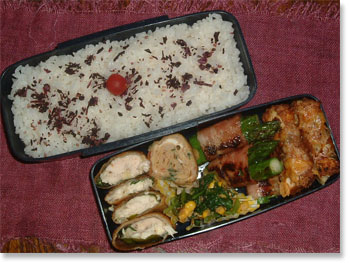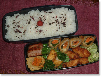 | 豚肉厚揚げ野菜巻き アスパラのベーコン巻 ホウレンソウとコーンソティ 厚焼き玉子(パセリ入り) ささみと大葉とチーズの春巻き カリカリ梅ご飯 |