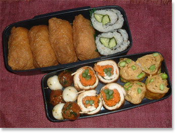 しょうが焼き ささみの野菜巻き(大葉・にんじん・インゲン) 厚焼き玉子(枝豆入り) 肉団子とうずら卵串刺し お稲荷さん・胡瓜と大葉の太巻き |