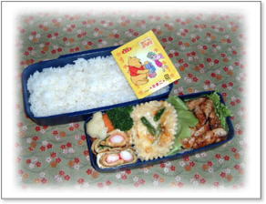 しゃぶしゃぶ用鶏肉のキャベツニンジン巻き 五目厚揚げと小松菜煮 ほうれん草入り厚焼き玉子 えびの天ぷら ご飯&ぷーさんふりかけ(やさい) |