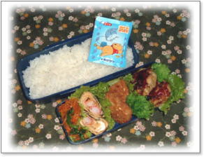 イカフライ 厚揚げチーズ、大葉豚肉巻き焼き 厚焼き玉子 ウィンナー(たこ) かまぼこのシソ挟み海苔巻き ごまわかめご飯 |