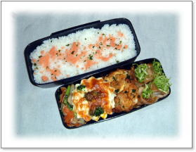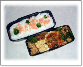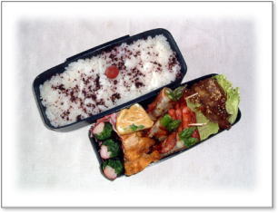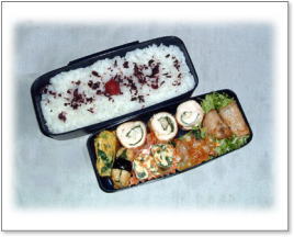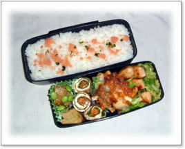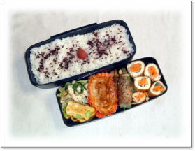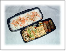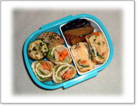 豚肉厚揚げまき(チーズ・大葉) 厚焼き玉子(ほうれん草入り) 金平ハンバーグの海苔巻き甘辛煮 カップラザニア(ワンタン皮・ミート・ホワイトソース)) 三色ご飯(ブロッコリー・豚ひき肉そぼろ・卵) |