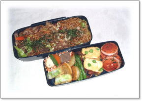 ソーセージ焼(パセリ) 厚焼き玉子(グリーンピース入り) ジャガイモとアスパラガスのソテイ はすの枝豆入りはさみ揚げ 煮物(人参・筍・こんにゃく・いんげん) 焼そば(豚肉・キャベツ・人参・青海苔) |