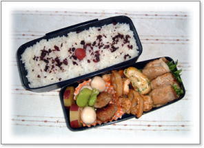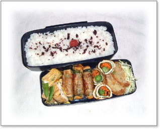 豚肉しょうが焼き(キャベツ巻き) 厚焼き玉子(パセリ入り) はすとベーコンとエリンギソテイ 金平ハンバーグ煮(うずら卵・そら豆添え) さつまいものレモン煮 カリカリ梅ご飯 |