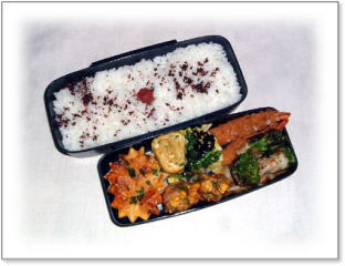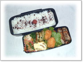エビフリッター(シュガーレディ) 豚肉野菜巻き(アスパラガス・エリンギ) 鶏から上げ海苔巻き 厚焼き玉子(グリーンピース入り) ほうれん草の胡麻和え カリカリ梅ご飯 |