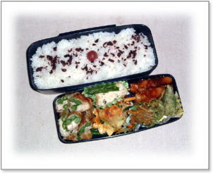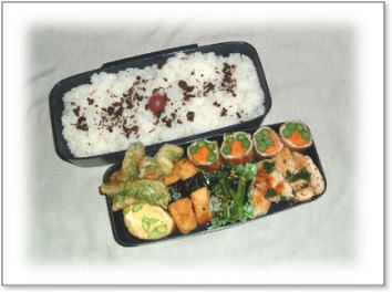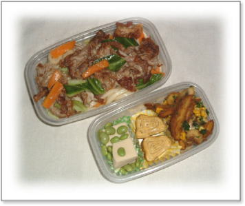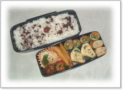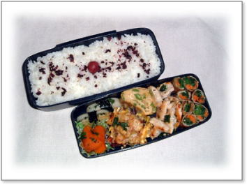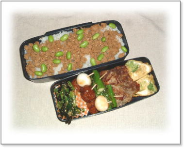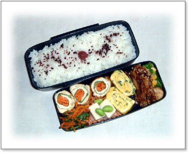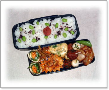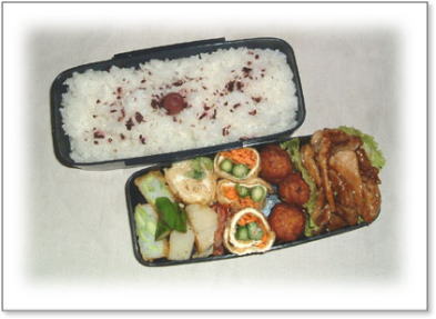 豚肉のしょうが焼き(キャベツ添え) 肉団子とうずらの串刺し 油揚げの野菜巻き(人参・いんげん・キャベツ入り) 厚焼き玉子(パセリ入り) 金平(人参・ごぼう) カップミートグラタン カリカリ梅と枝豆ご飯 |