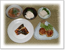 さば塩焼き 豆腐ハンバーグ(レタス添え) 冷奴(大葉添え) 2種 レンコン・水菜の味噌汁 玄米 |