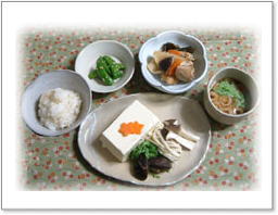 豆腐ときのこの蒸煮 (絹豆腐・エリンギ・しいたけ・えのき・水菜) 切干大根煮 (大根・しいたけ油揚げ・にんじん・鶏肉) スナックインゲンのバターソテー 水菜とお麩の味噌汁 玄米または白米ごはん |