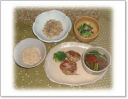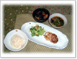 | 豆腐ごまハンバーグZ(温野菜添え) さつま揚げ入りひじき煮 大根・若布・万能ねぎの味噌汁 玄米 |