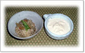 じゃぶじゃぶ(豚肉) 野菜 (キャベツ・人参・ほうれん草 *じゃがいもの千切り) 炊き込みご飯(ごぼう・人参) 汲み出しゆば |