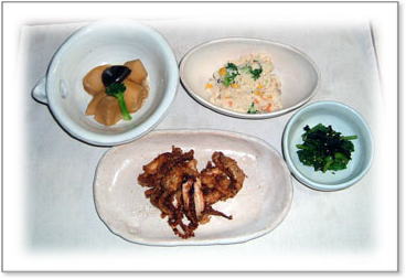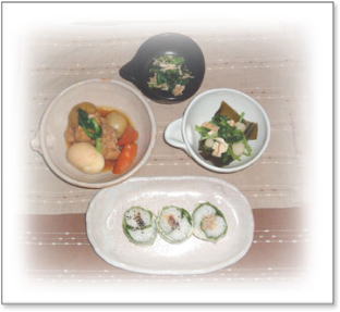 | 玄米ロール(サラダ菜・大葉・ごま) つくね煮(新じゃが・人参・ゆで卵・小松菜) 小カブと油揚の煮物(カブの葉) 小松菜とささみと焼き海苔の胡麻和え |