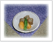 にんにくで炒めた手羽肉を 醤油・マーマレードで煮る ジャガイモ、ゆで卵も一緒に煮る アスパラなどを添える |