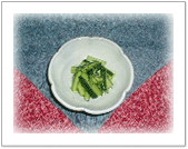 薄切りのカブを塩もみし、 カリカリに焼いたベーコンと マヨネーズ、練り梅で和える 聖護院大根と羅臼昆布で さっと茹でたプチヴェールを ごま、ピーナッツ(粉状)と マヨネーズで和えたもの ミキサーにかけたイチゴを お砂糖で煮て、 ゼラチンと生クリームを混ぜて 冷やしたもの あらめと人参、油揚で 薄だしで・・・ |