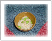 出しこぶを入れて炊いたご飯に 塩茹でした枝豆を加える |