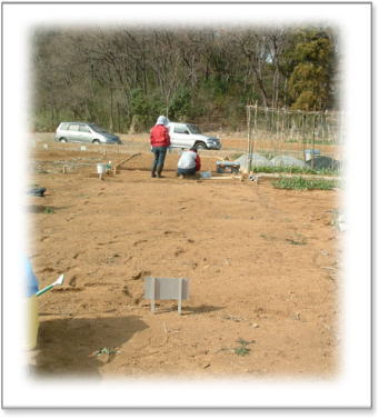 土を起こし、混ぜ、だんだん旗への土へ近づく・・・ ![]() ![]() 畑の周りに紐をはり、今日の仕事は終了! |