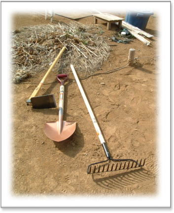 畑用「三種の神器」です。 クワ・スコップ・レーキ 近くのDIYショップで購入 |