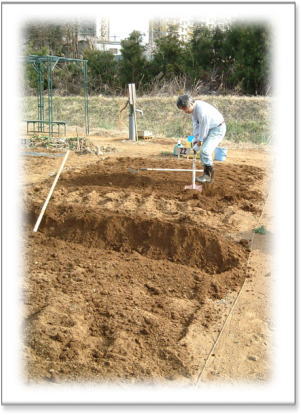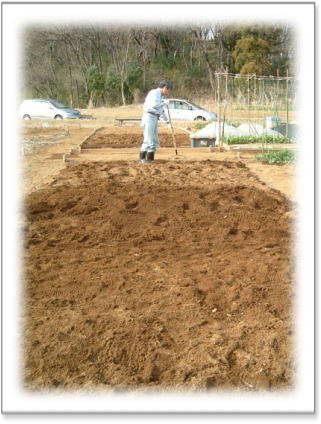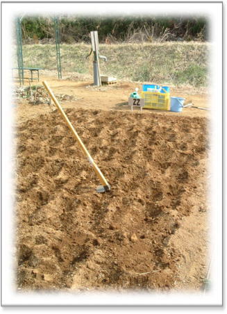 まずは、土作り。 苦土石灰を蒔き、土を混ぜ合わせる。 1週間土をそのままに・・・ |