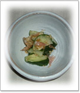 茗荷の酢漬けと 塩もみしたきゅうりに胡麻を散して・・・ |