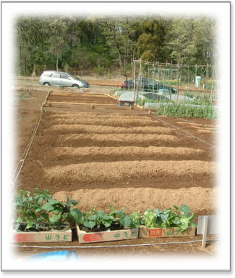 畑らしくなってきました。 8畝のうち、6畝にはそれぞれに、苗が植えられ、 お日様を一杯浴びて、 元気に大きくなる「はじめの一歩」です。 残りの2畝には後日、大根と人参の種をまく予定。 |