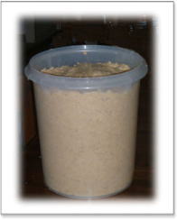 | こうして発酵するまでひたすら待ちます。 送ってくださるお味噌屋さんの話では、 味噌は寒いところを嫌がるそうで、家の中で一番温かいところ(我が家は台所)、に置いておくのが良いそうです。 12月仕込みは5月初旬ごろ、6月仕込みは10月初旬ごろ食べごろになりますが、 その時の気温などによって、出来上がりの時期や味がかなり違います。 発酵が進むと、味噌は真っ赤(茶色)になります。 私は、発酵の浅いものが好きなので、いい具合の時に、タッパーに小分けして、冷蔵庫に移します。 こうすることで発酵をほぼ止め、お好みの状態で保存することができます。 |