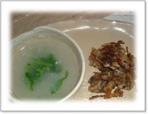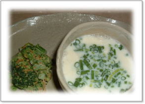 | 豆乳スープ(万能ネギいり)とブロッコリーのピーナッツ和え ブロッコリーの茎って、本当に美味しいんですね。 歯ごたえもあって・・・ 豆乳スープのだしは昆布で。 |