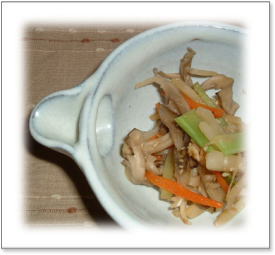 きんぴら 人参・ブロッコリー・はす・舞茸・・・ 冷蔵庫のお掃除の一品です。 お弁当にもぴったりですね。 |