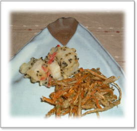 | 山芋と人参の黒ゴマ揚げ & ごぼうと人参の掻き揚げ 長いもはシャキシャキ感が残っているくらいがいい。 ごぼうと人参は金平で味付けしているので、 粉をつけてあげるだけ。 |