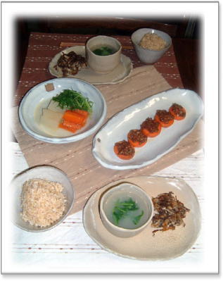 | 玄米 カブのポタージュ きのこナゲット 人参の味噌のっけ 大根・人参・水菜の煮物(昆布だし) |