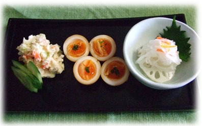 *なます 作ってもあまり食べてくれなかったので いつの間にか作らなくなっていたのですが、 今年は、息子が自分で買ってきましたわ。 主人の実家の庭のゆずを添えて・・・ しゃきしゃきして美味しい! *酢卵 今年もやっぱり、箸休めに・・・ *ポテトサラダ マヨネーズ嫌いな娘の為に、マヨネーズは控えめにして、 セロリのみじん切りをたっぷり入れて、 しゃきしゃきさっぱりと・・・ |