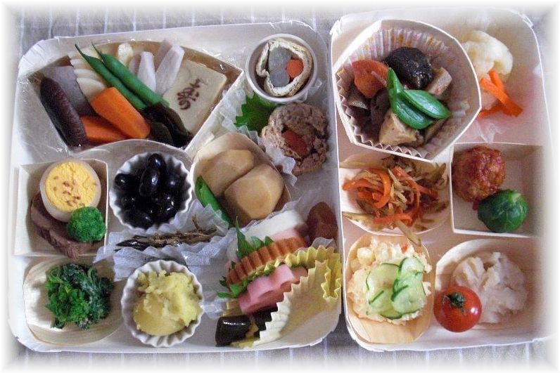 画面左上段より *煮豚と茹で卵 *信田巻き/油揚げ野菜巻き(柚子こしょう味) *筑前煮 画面左中段より *ミートボール(トマトソース) *かまぼこ/伊達巻 *はすの梅酢漬け *数の子の鰹節和え *菜花胡麻和え *高野豆腐煮(筍、はす、人参、こんにゃく、干し椎茸、スナップインゲン) 画面左下段より *里芋煮 *黒豆 *栗きんとん *きんぴら *田作り |