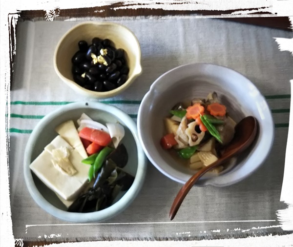 ![]() ![]() *黒豆煮* 仕事場仲間のお父様が育てた丹波の黒豆 美味しいこと!! *筑前煮* おせち料理の定番ですね! *高野豆腐と湯葉の煮もの* むすび昆布、むすび湯葉も添えて・・・ *のし鶏* 数すくない肉料理です。 100縁Shopで見付けた お正月用の飾り楊枝を *信田巻き* 我が家の定番 *きんぴらごぼう* 人参とゴボウの王道 *里芋煮/こんにゃく煮* 里芋は頂き物ですが、とてもねっとりの美味しいものでした。 こんにゃくは、2年ぶりに手作りしました。 近くの農家さんが、こんにゃくいもをお裾分けして下さり、 2回目で成功!! *栗きんとん* 今年も熊本から知りあいが買い求めた箱買いの「シルクスウィト」で作りました *ハム/焼き豚* 年末に頂いたもの *酢卵* 色も鮮やか、我が家の定番 *椎茸のマリネ* 一昨年、ネットで出会った「ひのきの森 By BMD ミモレ農園マルシェ」 (http://www.mybmd.jp/shopbrand/ct153/) 「紅くるり、紅しぐれ、ビタミン大根」の切り干し大根は、 言葉に出来ない自然の鮮やかな色と優しい切り干し大根のお味。 地味な椎茸が生まれ変わります *鶏ハム* 世間的には、かなり前に流行ったもの 塩麹とオリーブオイル、塩コショウに付けた鶏むね肉に人参を芯にして クルクル巻いてジップロックに入れて、アルミで包んで、沸騰したお湯に1分。 後は、余熱で・・・ *数の子/蒲鉾/伊達巻* 今年は、「紀文」のものを頂きました *レンコンの梅酢漬け/千枚漬け* 紅玉梅酢と梅干しで色付けのレンコンは息子の大好物 千枚漬けは、年末に、いただいた聖護院大根で作りました。 |